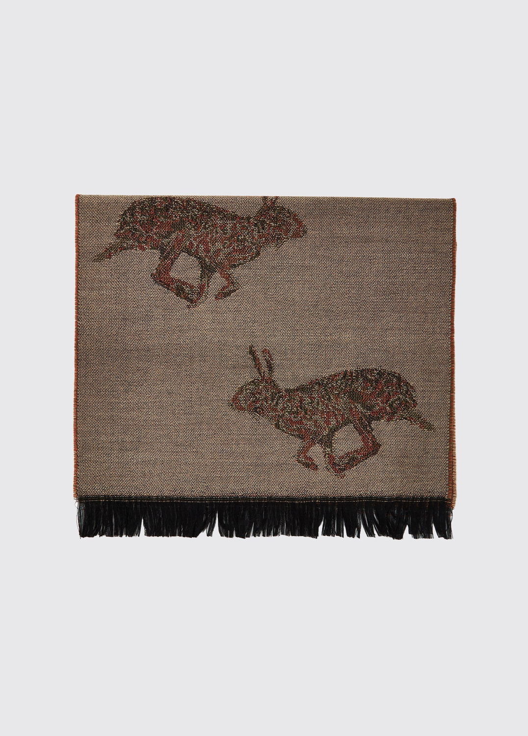 Cette étole très spéciale, ornée d'un motif de lièvre réalisé sur mesure, peut compléter avec finesse une tenue de soirée ou être appréciée au quotidien comme couche chaude. Tissé en Ecosse en 100% laine, c'est un accessoire précieux et un merveilleux cadeau.