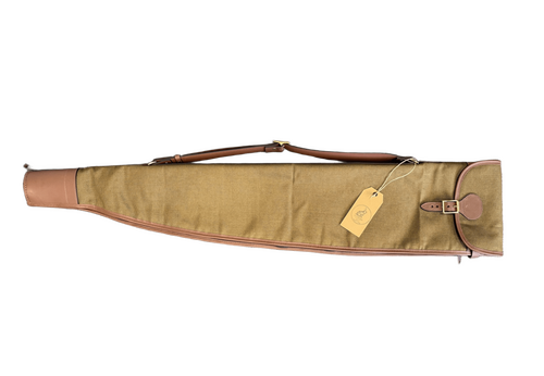 Fourreau carabine en lin (Français) et cuir avec rabat et zip sur toute la longueur pour faciliter le séchage. Sangle d'épaule et extrémité renforcée. Doublure polaire matelassée.