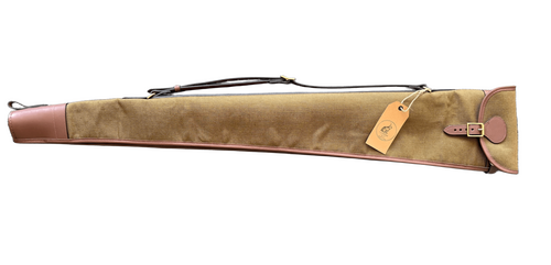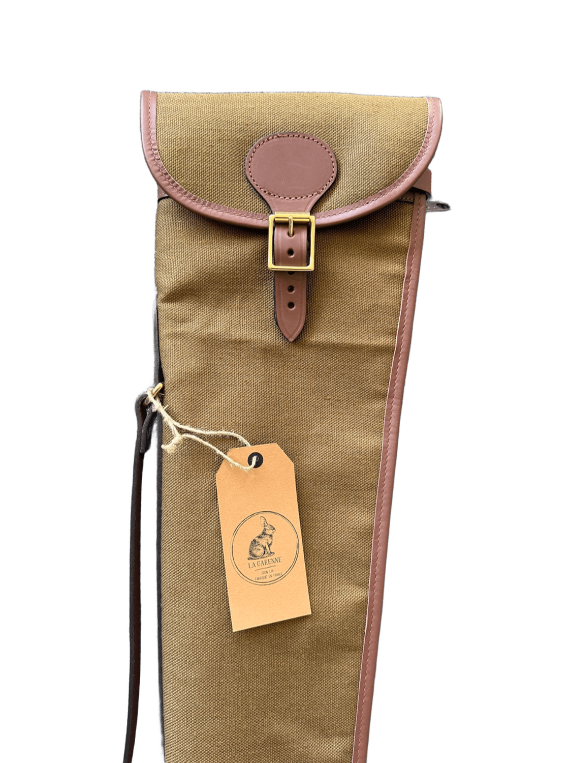 Fourreau fusil en lin (Français) et cuir avec rabat et zip sur toute la longueur pour faciliter le séchage. Sangle d'épaule et extrémité renforcée. Doublure polaire matelassée.