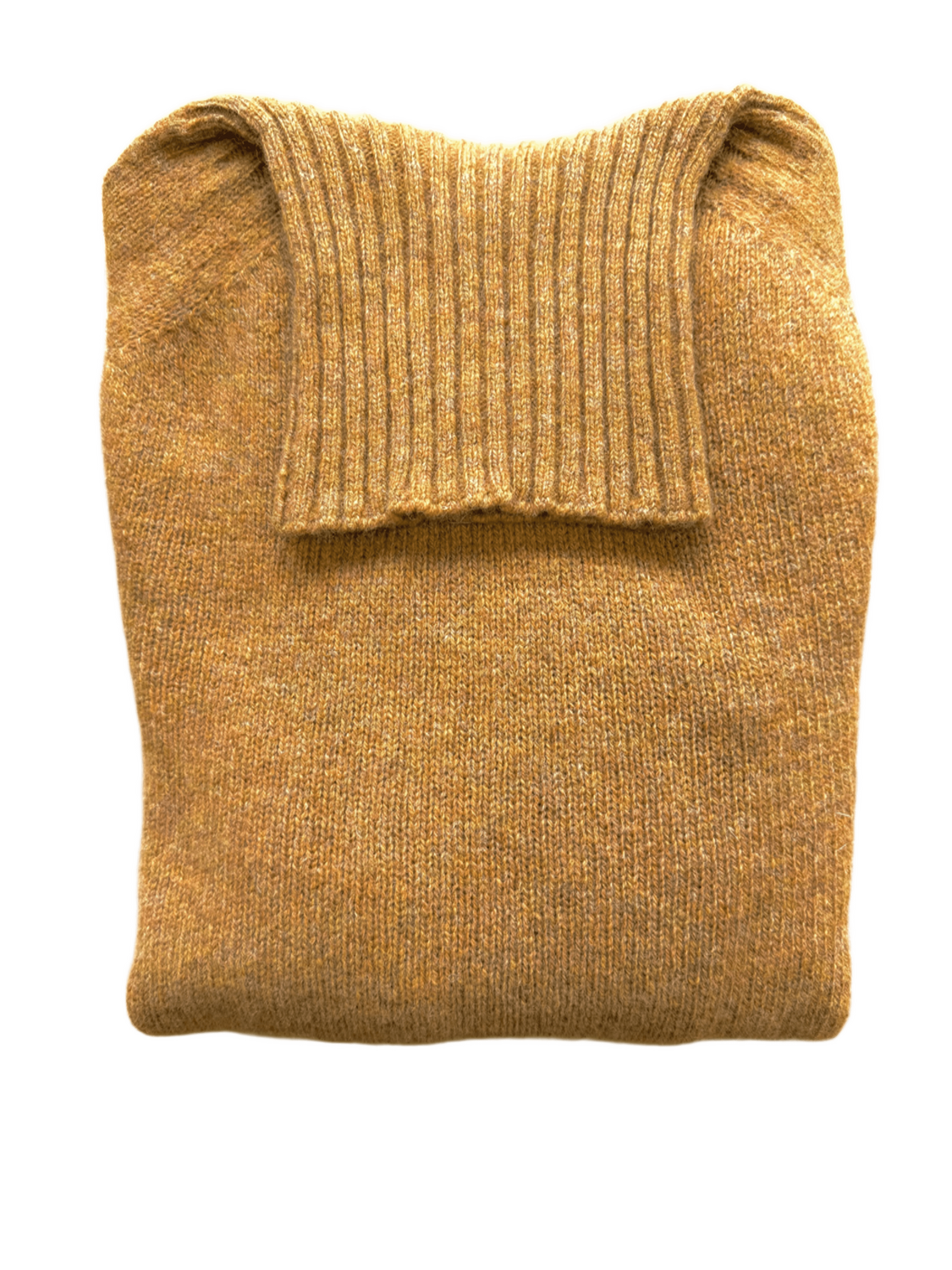 Pull col roulé de chez Harley of Scotland, ici dans le coloris gold rust (dernier coloris du bas sur la pile en photo).