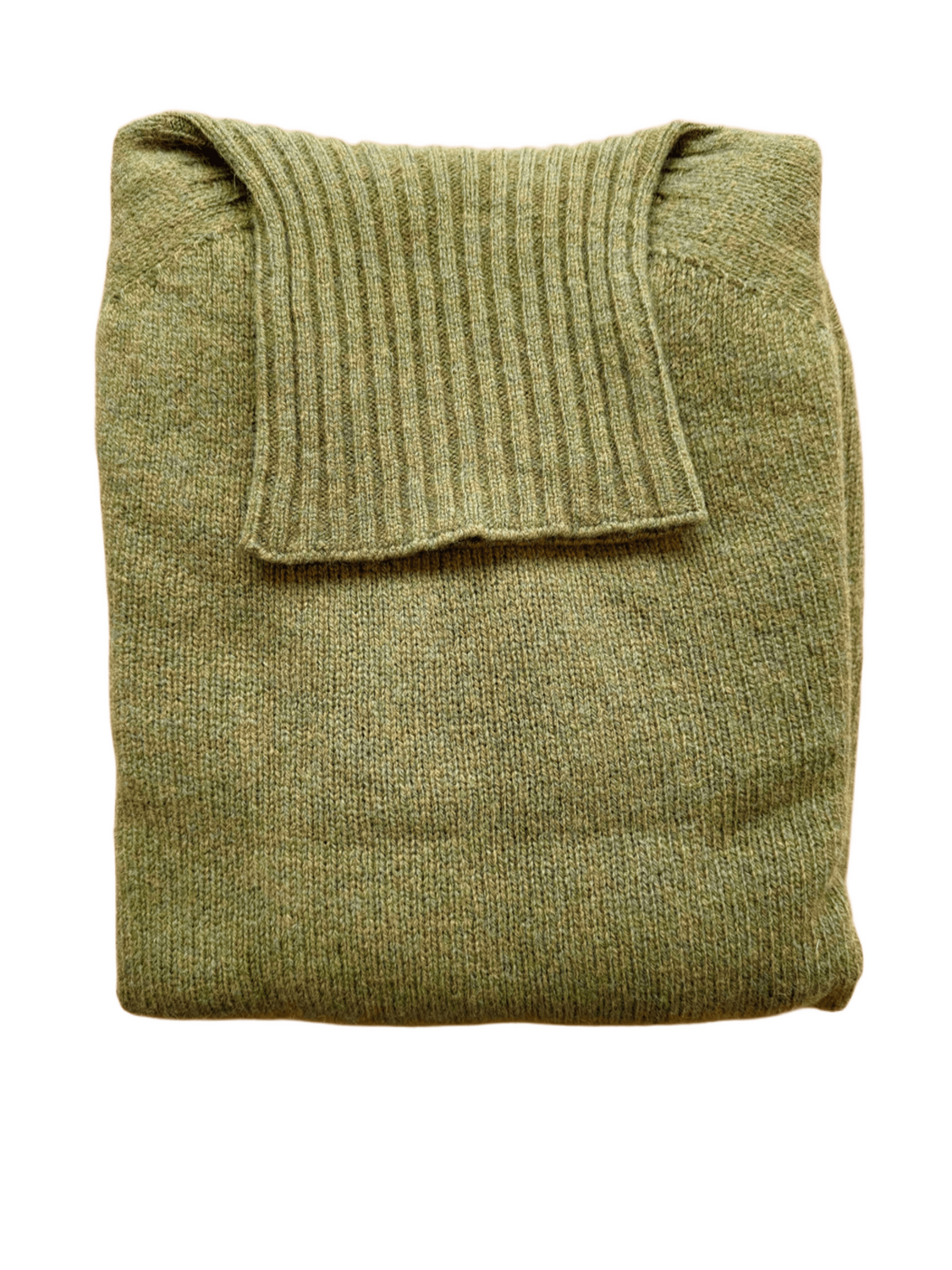 Pull col roulé de chez Harley of Scotland, ici dans le coloris lichen (deuxième coloris en partant du bas sur la pile en photo).