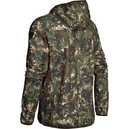 Integrated facemask and tight-fitting hood provide optimal mobility and camouflage, suitable for both bow hunting and stalking.